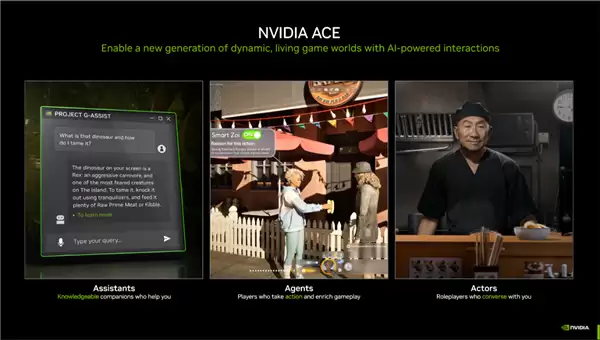 在游戏AI领域NVIDIA也有深入布局,于2023年首次亮相的NVIDIA ACE作为一套RTX加速的数字人技术,其应用范围已从对话型NPC扩展到拥有自主意识的游戏角色。