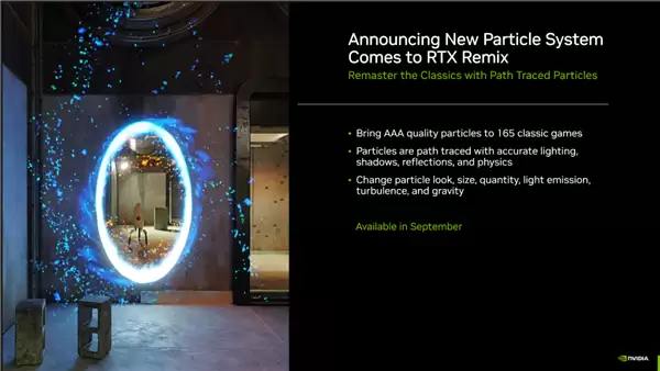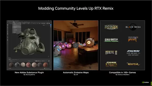 对于模组社区,NVIDIA为RTX Remix引入了全新的路径追踪粒子系统,该功能可为超过165 款经典游戏带来3A级别的光照、阴影和物理效果,让老游戏焕发新生。此外,新的Adobe Substance插件和社区成员创建的自动发光贴图功能,也极大地提升了RTX Remix的易用性和创作潜力。