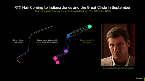 在图形技术方面,RTX Hair技术将于9月在《夺宝奇兵:古老之圈》中首发亮相。该技术利用基于线性扫描球体的实时路径追踪,实现了更逼真、更高效的头发渲染,其所需数据量仅为传统方法的 1/3。