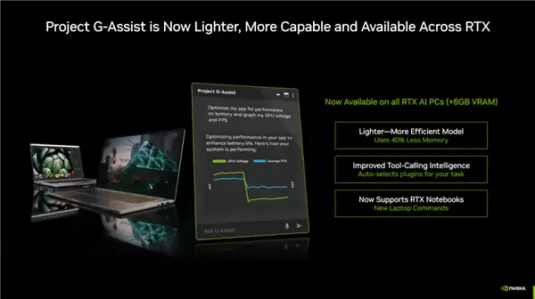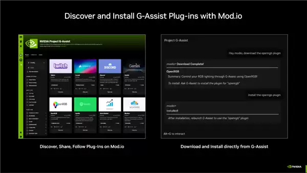 AI助手Project G-Assist也迎来全面升级,更加轻量化和高效,并支持所有拥有超过6GB显存的RTX AI PC,内存占用降低了40%。NVIDIA还与Mod.io合作,为G-Assist建立了开放的插件生态系统,允许社区开发者创建各种实用插件