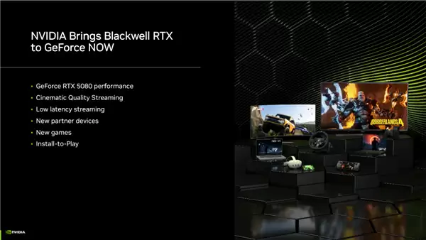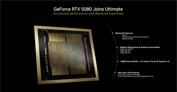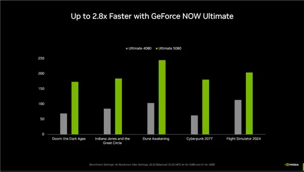为了实现这一目标,NVIDIA宣布将Blackwell架构GeForce RTX 5080 GPU引入GeForce NOW。升级后的GeForce NOW RTX 5080 SuperPOD能够提供最高达5K@60/120 FPS、1080p@360 FPS以及1440p@240 FPS的帧率,NVIDIA表示其性能可达桌面版RTX 4080的2.8倍,原始性能更是PS5 Pro的3倍。