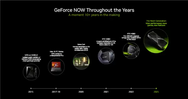 在云游戏服务GeForce NOW方面,NVIDIA回顾了十年来的发展历程后,明确了未来的新目标:更强性能、更多游戏、更丰富功能。