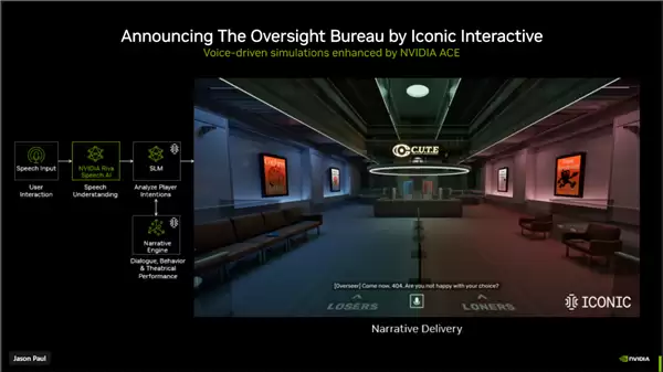 在由NVIDIA ACE增强的《The Oversight Bureau》演示中,游戏中的NPC能够通过整合语音理解、小型语言模型和叙事引擎,与玩家进行自然、实时的语音互动,并根据玩家意图生成相应的行为,极大地提升了游戏的沉浸感。