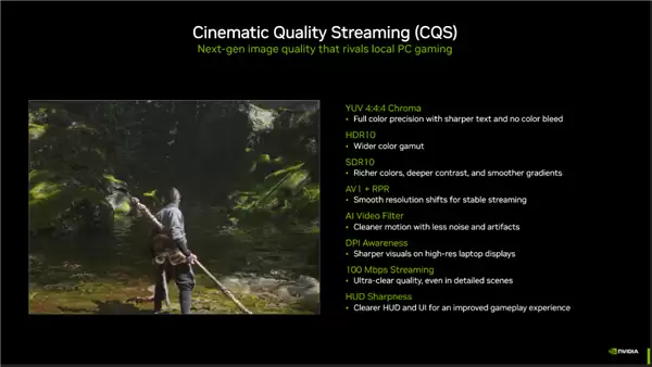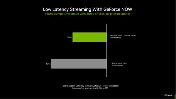 为了匹配强大的硬件,NVIDIA 还推出了两项革命性的云游戏流媒体技术:影院级质量流(Cinematic Quality Streaming, CQS)和低延迟流(Low Latency Streaming, LLS),确保云端串流的图像质量能媲美本地PC游戏,总延迟也降低至30毫秒,甚至优于PS5 Pro的本地游戏延迟。