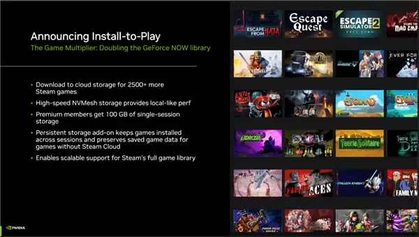 GeForce NOW的应用场景和游戏也在持续扩展,除了新游戏不断加入,NVIDIA还推出了全新的“即装即玩”(Install-to-Play)功能。该功能允许玩家将游戏下载至云端存储,兼容超过2500款额外的Steam游戏,使GeForce NOW的游戏库规模瞬间扩大了一倍。