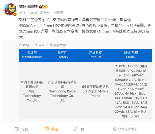 8月19日消息,据博主数码闲聊站介绍,魅族22目前已经三证齐全,静待上市了。