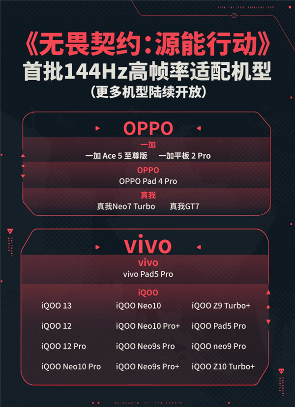 首批144Hz高帧率适配机型有一加Ace 5至尊版、一加平板2 Pro、OPPO Pad 4 Pro、真我GT7、vivo Pad 5 Pro、iQOO 13、iQOO 12、iQOO Neo10等机型。