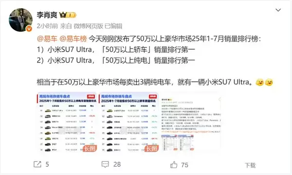 8月18日,易车榜发布最新统计数据,在50万元以上豪华车市场中,2025年1-7月销量排行榜显示,小米SU7 Ultra荣膺50万元以上轿车销量冠军,同时在50万元以上纯电动车细分市场也位居首位。