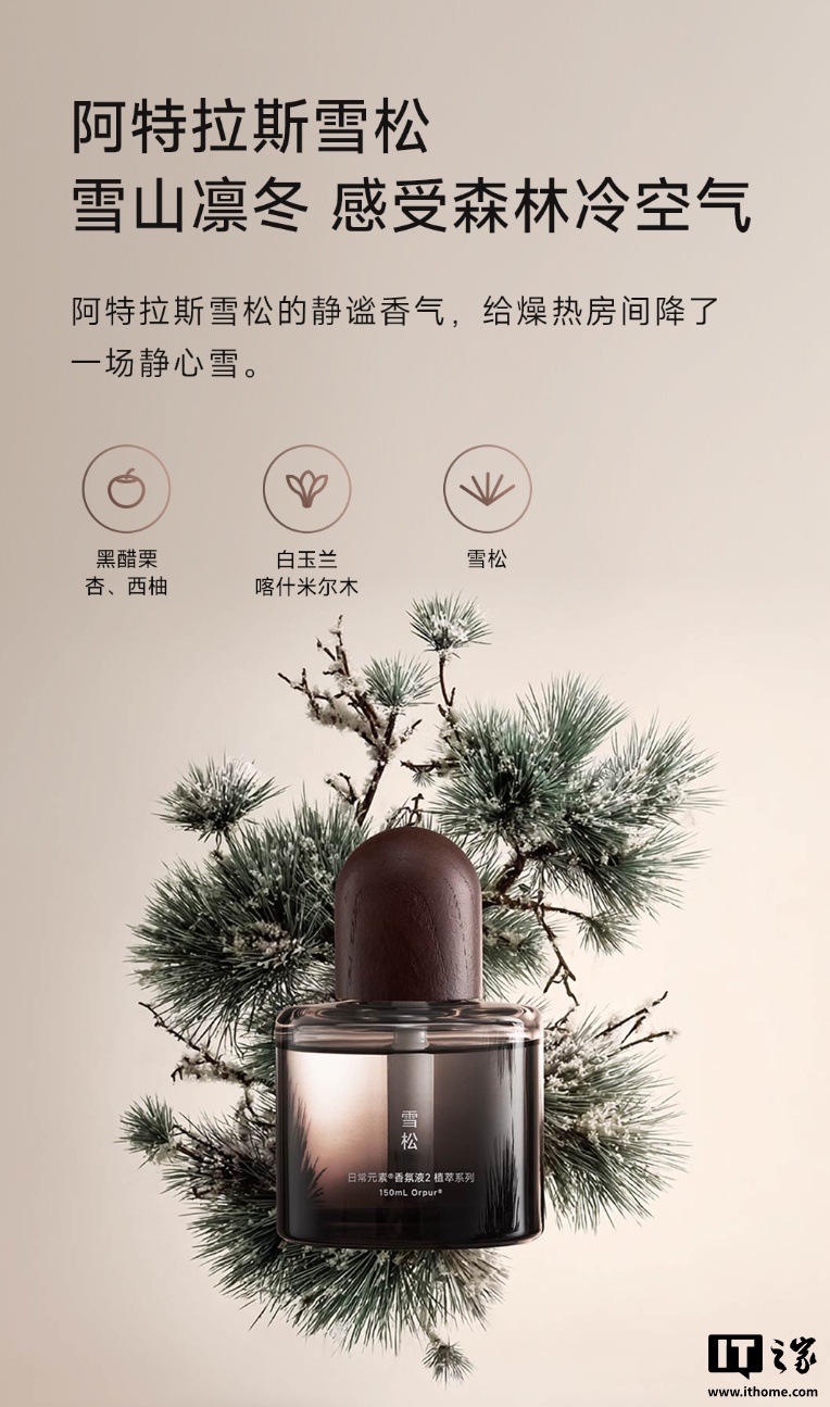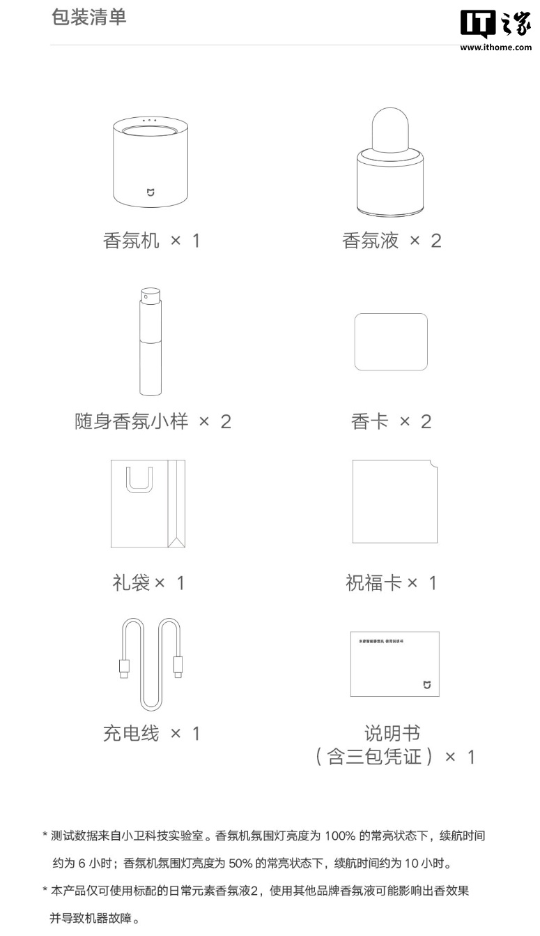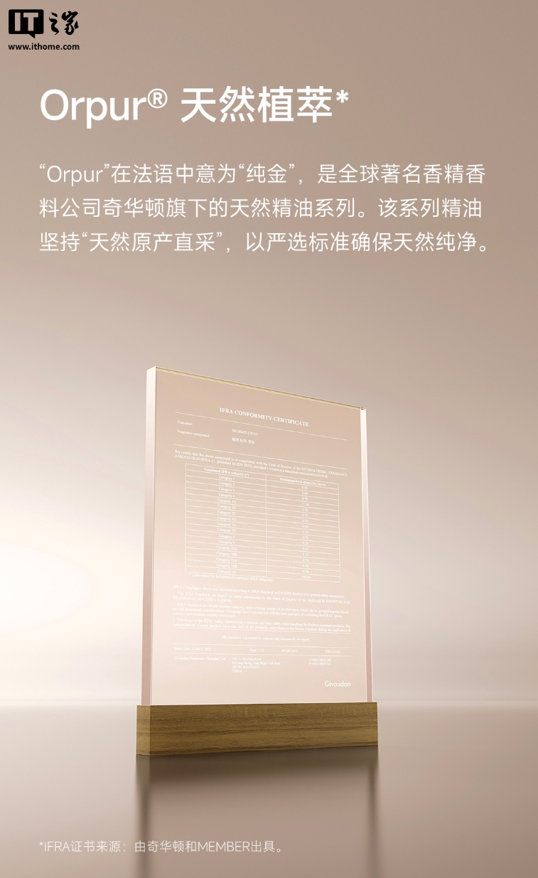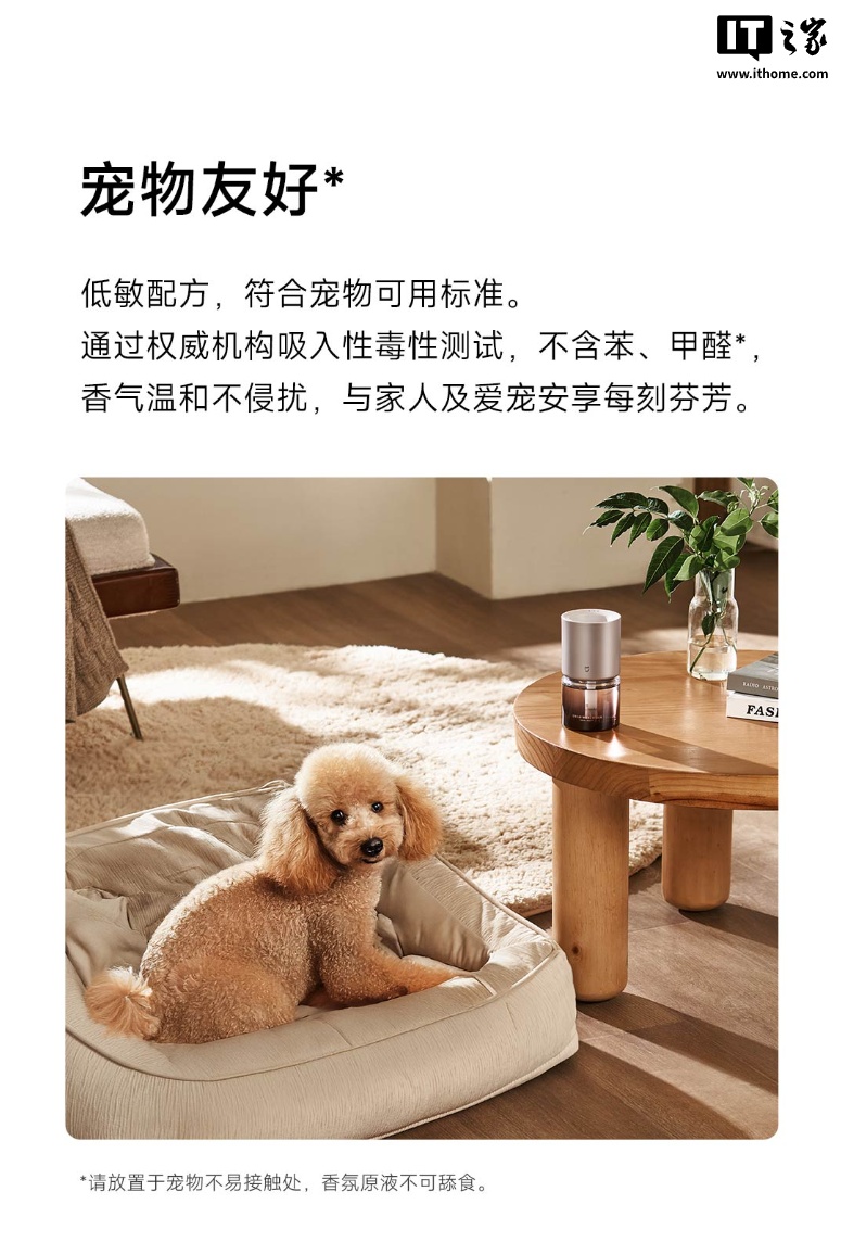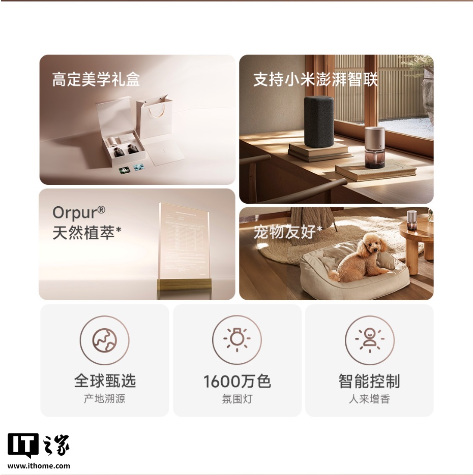 本次礼盒内随附的香氛均为 Orpur 天然植萃,采用低敏配方,符合宠物可用标准,不含苯、甲醛,香氛机本体可与小米音箱等智能设备联动,用户可用小爱同学直接控制香氛机的开关。