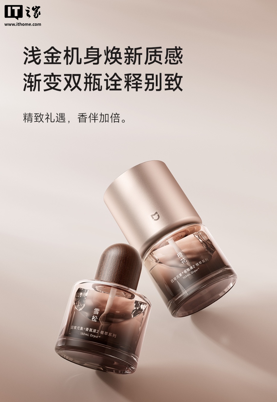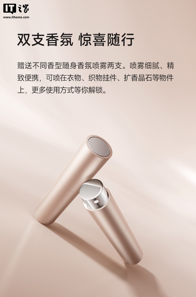 据小米介绍,这款香氛机套装中的主机相比已上市的米家智能香氛机在硬件上没有太大区别,主要是将机身配色换为了浅金色,与自带的香氛底色更加搭配。