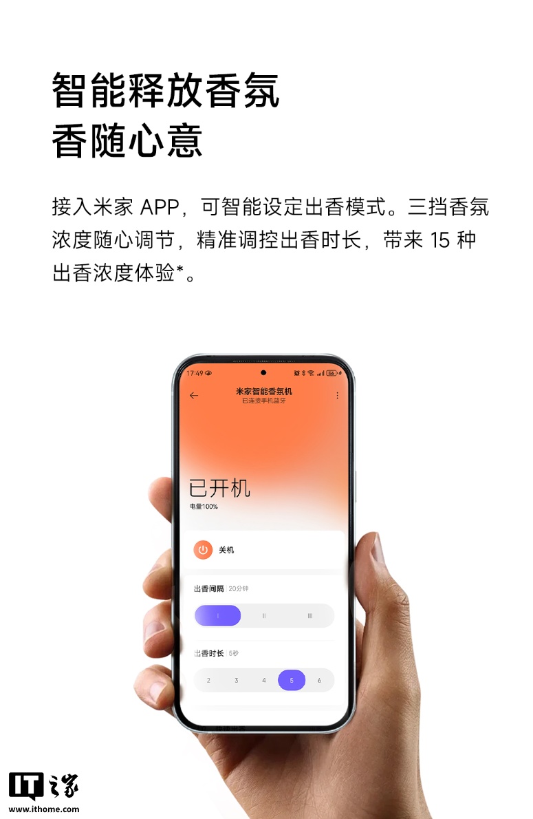 另外这款香氛机接入了米家 App,用户可在手机 / 平板中自由设定出香模式,内置 3 档香氛浓度调节,出香时长也可根据喜好自由调整。