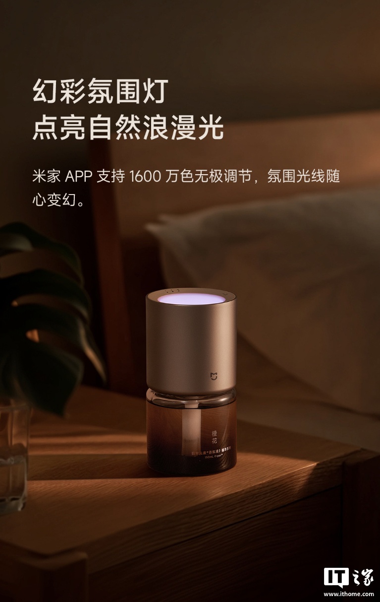 同时这款香氛机还内置有氛围灯,发光颜色可达 1600 万色,支持使用米家 App 调节。
