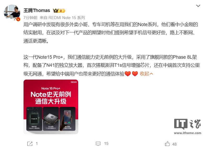 首次支持公里级无网通话:小米 REDMI Note 15 Pro + 手机将配备澎湃 T1s 信号增强芯片