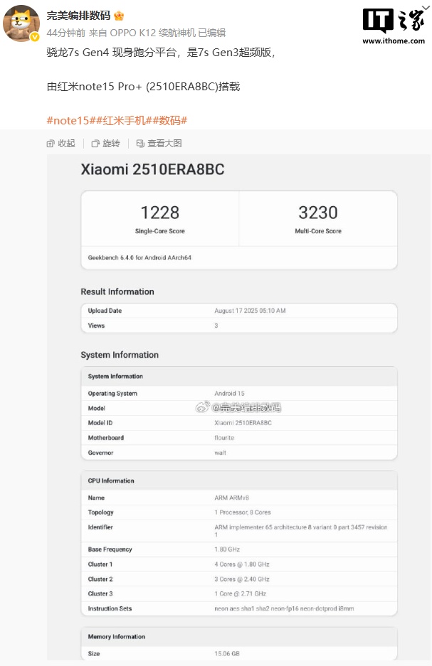 这款小米新机的 CPU 由 4 Cores @ 1.80 GHz+3 Cores @ 2.40 GHz+1 Core @ 2.71 GHz 组成,预计为骁龙 7s Gen4 处理器,博主 @完美编排数码 预测这款手机是 REDMI Note 15 Pro+。