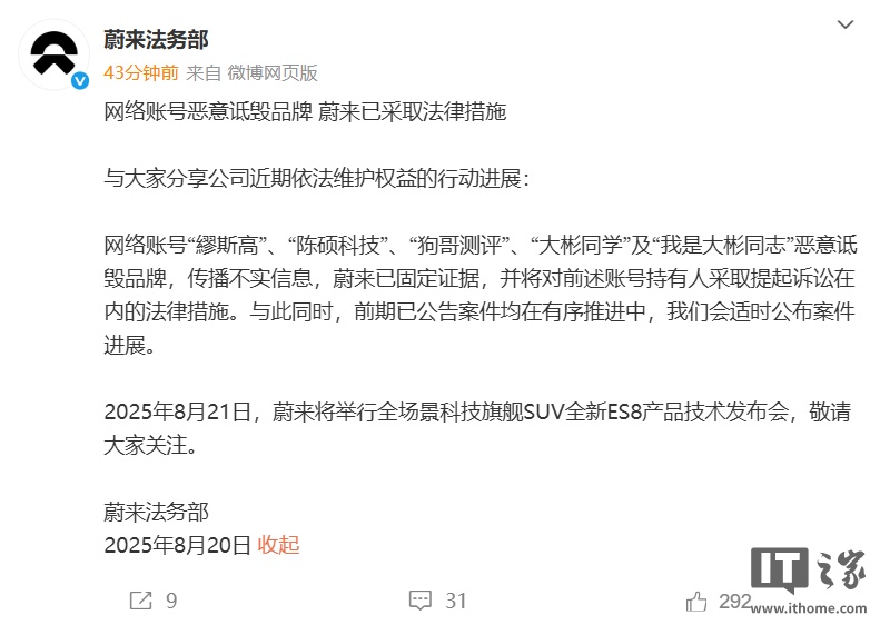 8 月 20 日消息,蔚来法务部今日发文称,网络账号“繆斯高”、“陈硕科技”、“狗哥测评”、“大彬同学”及“我是大彬同志”恶意诋毁品牌,传播不实信息,蔚来已固定证据,并将对前述账号持有人采取提起诉讼在内的法律措施。