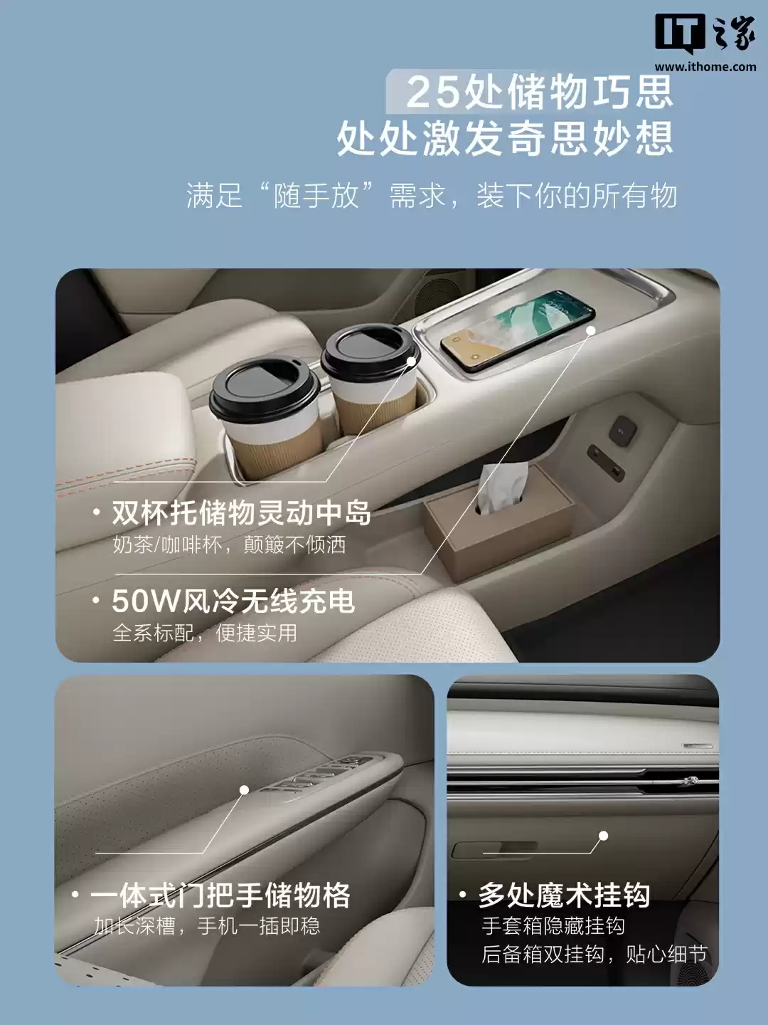 内饰采用柔白与暖棕双色搭配,辅以3D木纹饰板和大面积皮质包覆,搭配豪华感突出的镀铬装饰。车内设有25处储物空间,包括独特的魔术挂钩和门把手储物格。后备厢通过下沉式设计实现灵活空间组合,后排座椅放倒后可扩展至1450升超大容积。