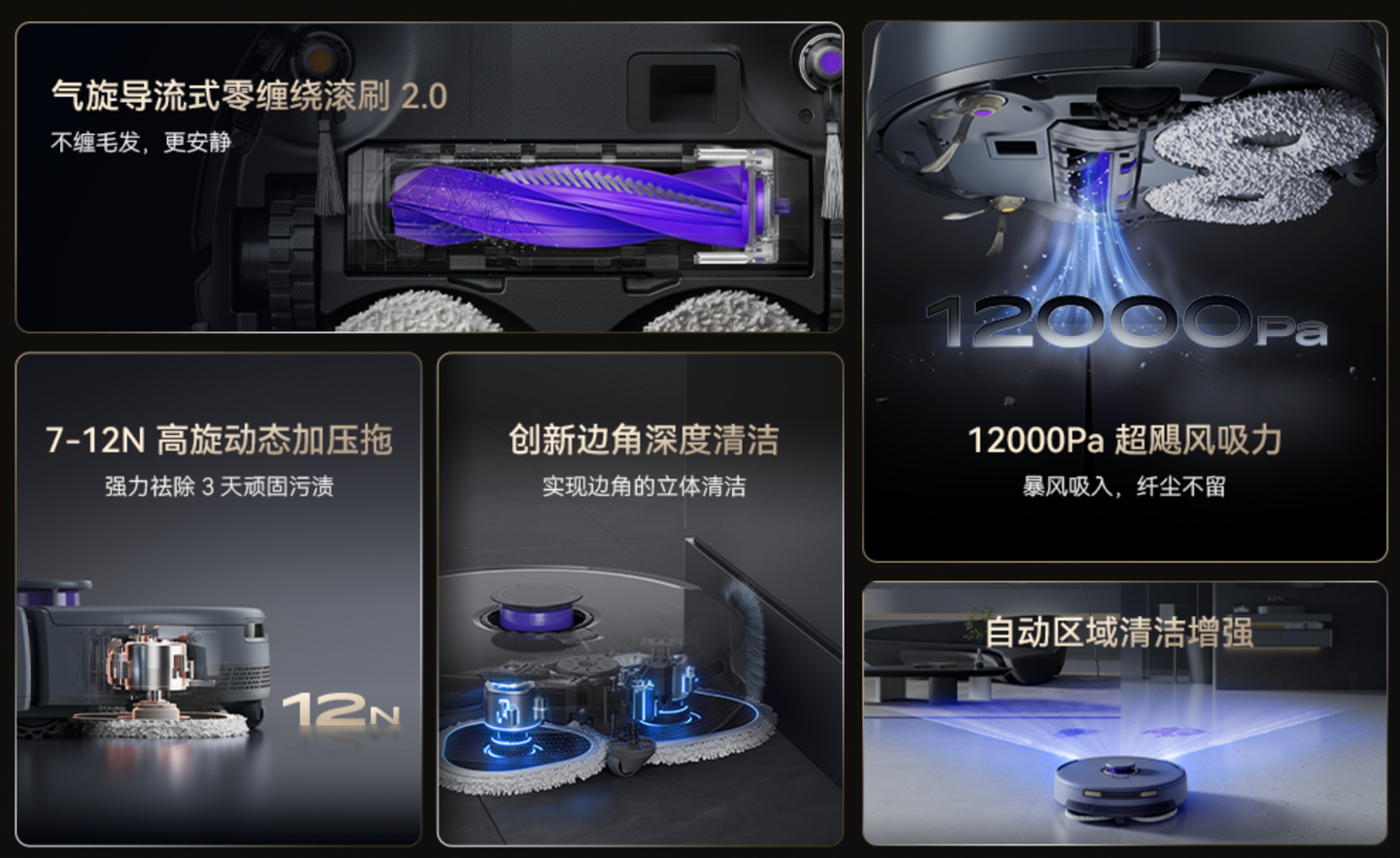 清洁力方面,逍遥 001 搭载气旋导流式灵缠绕滚刷 2.0,滚刷每分钟 4400 次扫地的同时噪音为 59dB;拥有“行业顶配”的 12000Pa 吸力,并支持边角深度清洁、搭载 SPA 级地板养护功能。