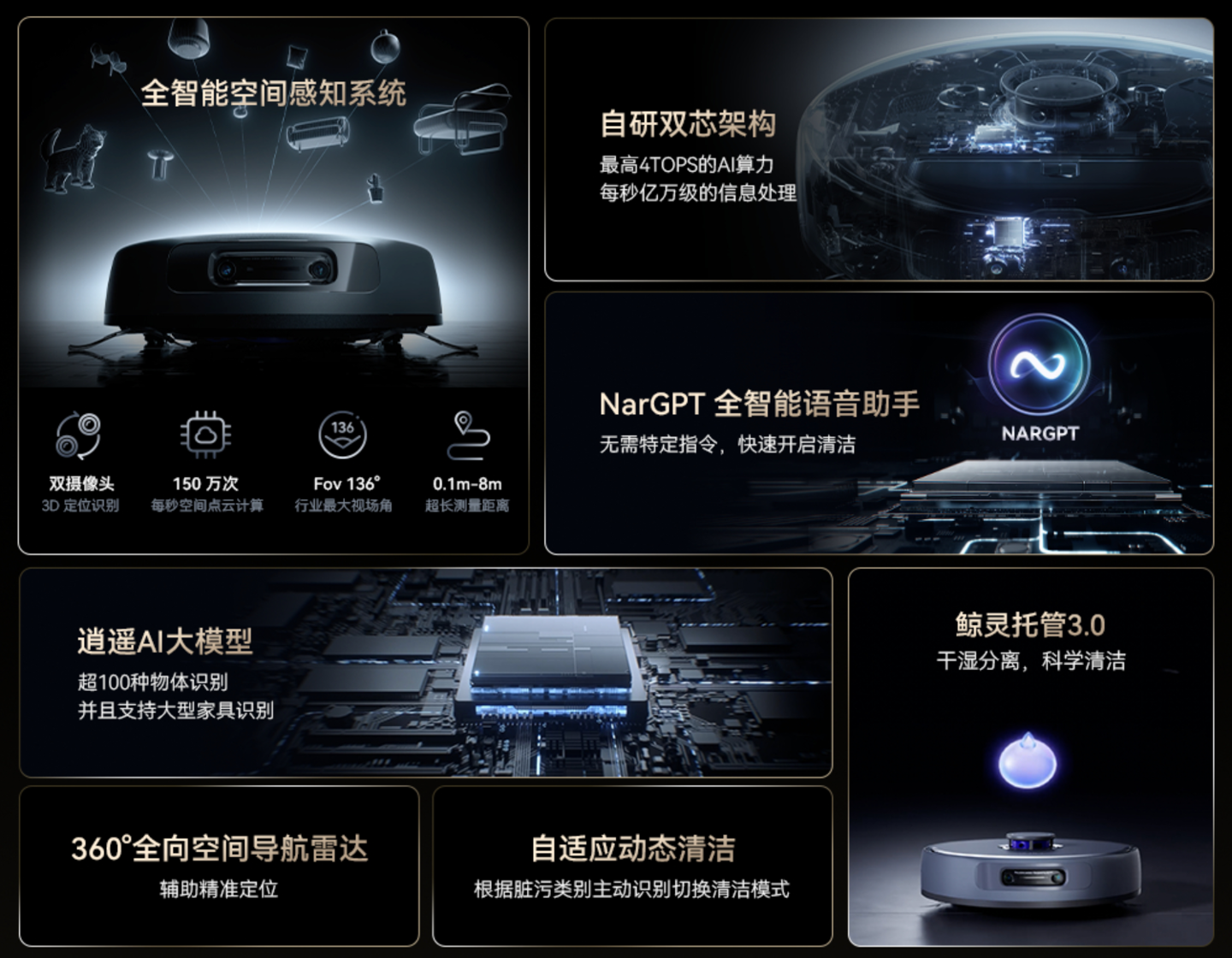 云鲸逍遥 001 搭载全智能空间感知系统,搭载双目摄像头、FOV 达 136°,每秒进行 150 万次空间点云计算,具备最小 5mm 识别精度,自研双芯架构算力可达 4TOPS。它还搭载逍遥 AI 大模型与 NarGPT 语音助手,支持超 100 种物体识别与简单、多意图、模糊意图、召唤清洁等多种语音交互。