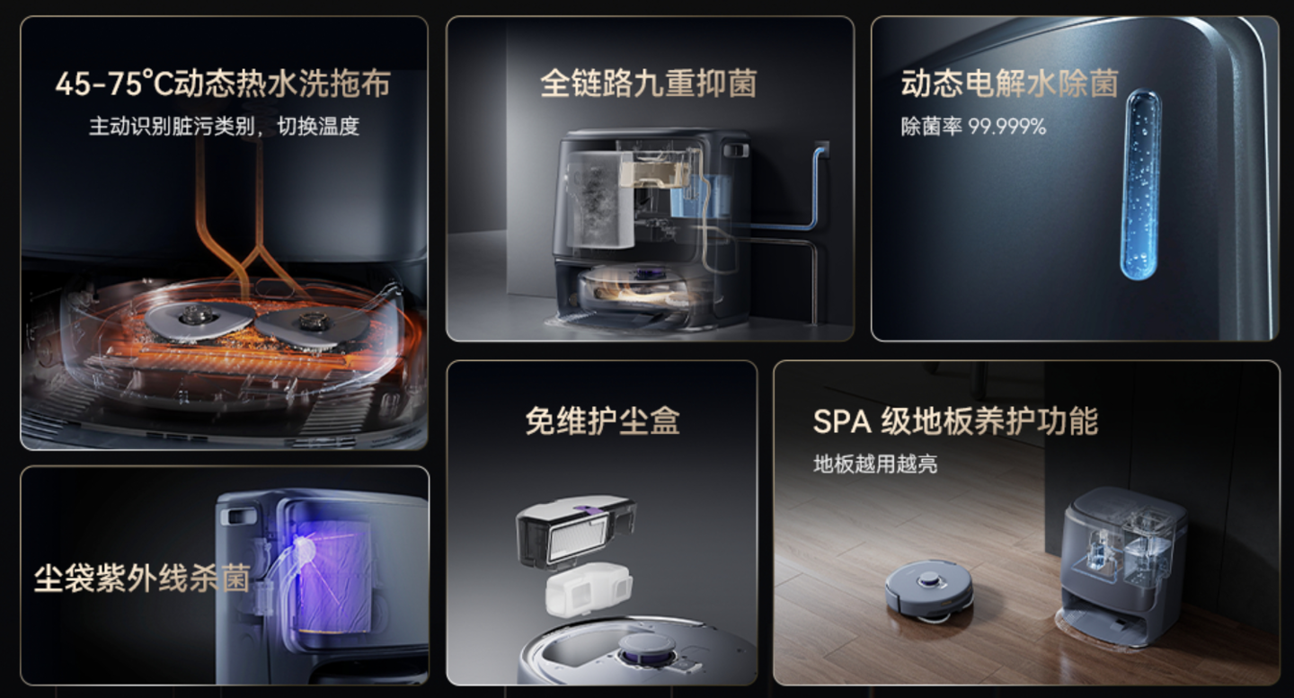云鲸逍遥 001 支持 45-75°C 动态热水洗拖布、动态电解水除菌,双重主动干燥技术可对尘盒和尘袋进行热风烘干;2.5L 尘袋结合多重抑菌处理,可实现长达 120 天的免维护托管。