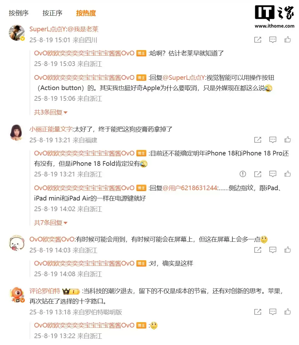 最新消息由热心网友 Domado 提供线索!知名数码博主 @OvO欧欧奕奕奕奕宝宝宝宝酱酱OvO 于昨日(8月19日)发布微博透露,苹果公司已正式通知供应链取消相机控制按键的生产计划。这意味着即将发布的 iPhone 17 和 iPhone 17 Pro 系列很可能成为最后一款配备相机控制(Camera Control)功能的 iPhone 机型。