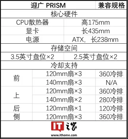 迎广PRISM机箱采用中塔规格,机身尺寸为530×275×500毫米,配备7个扩展插槽并支持显卡垂直安装。该机箱适配背插式主板设计,对硬件兼容性表现出色:支持最高175毫米的CPU散热器、435毫米长度的显卡以及238毫米电源。散热方面可同时安装三组360毫米冷排,详细规格参见下表: