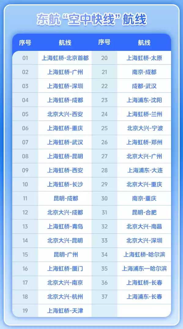 8 月 20 日消息,东方航空宣布,8 月 20 日起,东航升级上海虹桥 — 北京首都、上海虹桥 — 广州、上海虹桥 — 深圳等在内的境内“空中快线”服务,旅客选择相关航线的宽体机超级经济舱和经济