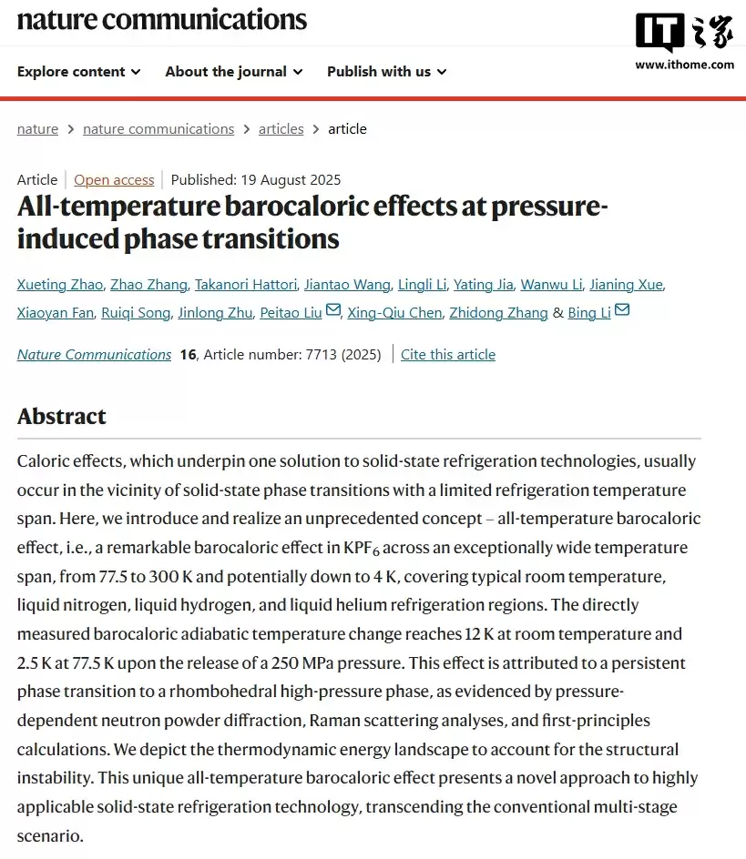 中国科学家首次发现全球唯一全温区固态相变制冷材料