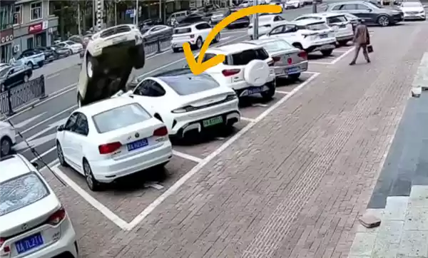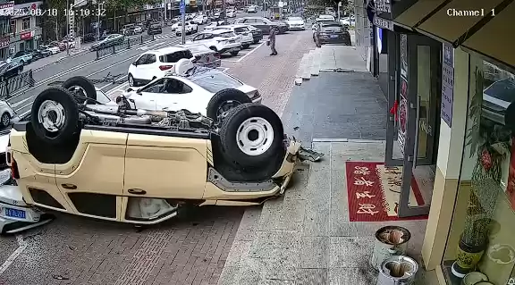 而后车身失衡,翻滚着又砸中了另外两辆正常停放的车辆,最终整个翻了个底朝天,幸运的是全程没有撞倒行人。