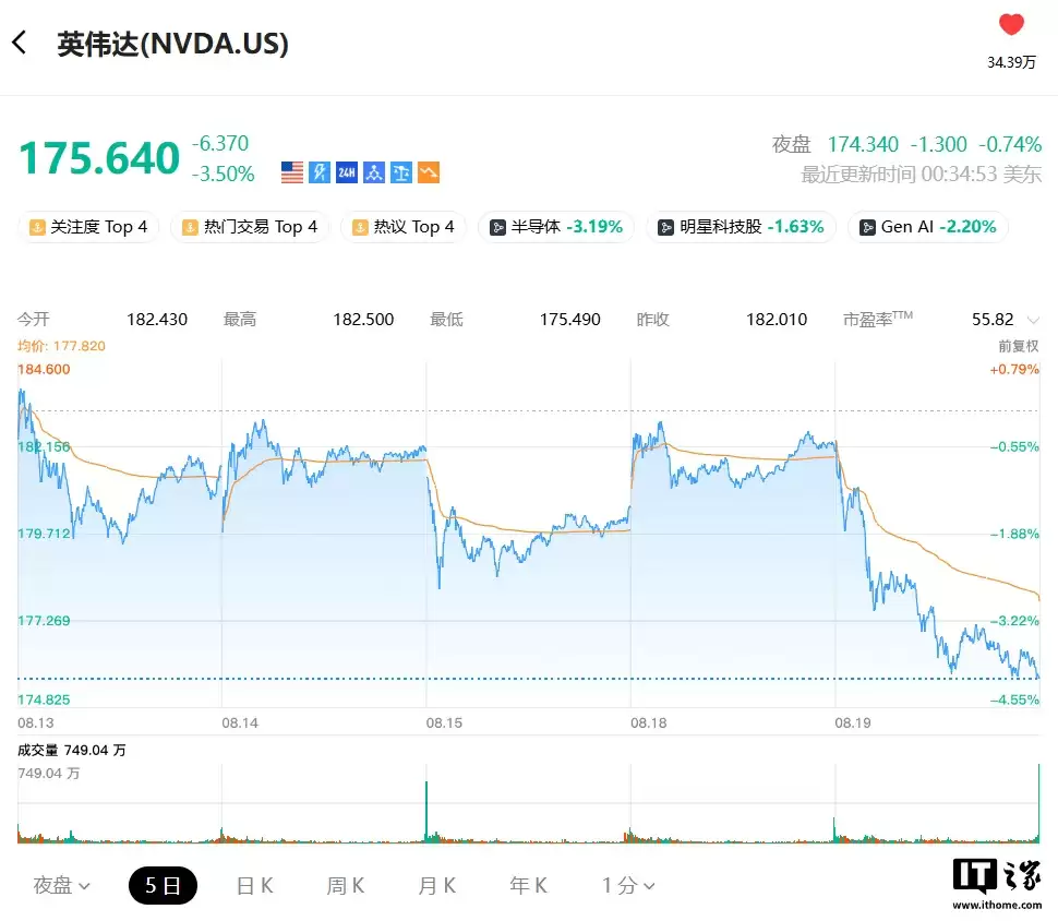 同时科技相关股票也有不同程度的下跌,英伟达今日凌晨收盘时股价为 175.64 美元(现汇率约合 1262 元人民币),跌 3.5%,市值蒸发超过 1550 亿美元(注:现汇率约合 1.11 万亿元人民币)。