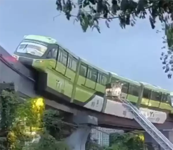 现场目击者拍摄的视频画面显示,这列电车滞留在弯道区段的高架轨道上。值得注意的是,该处轨道本身带有一定倾角,从远处望去,整列车厢呈现明显的倾斜状态。