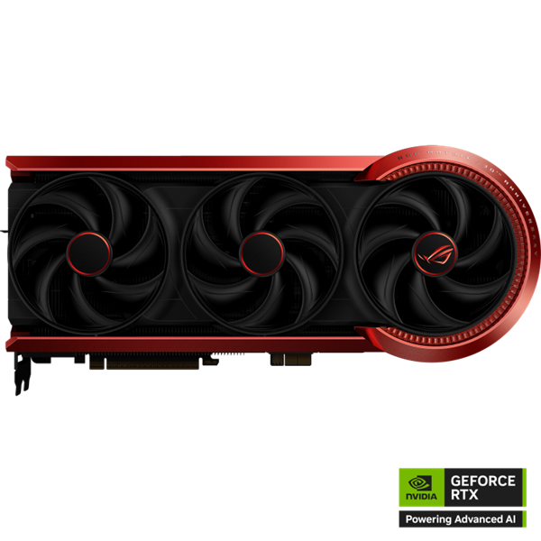 这款显卡采用了华硕标志性的红黑配色方案,配备四风扇散热设计,显卡正面有三个风扇,背面还有一个风扇。