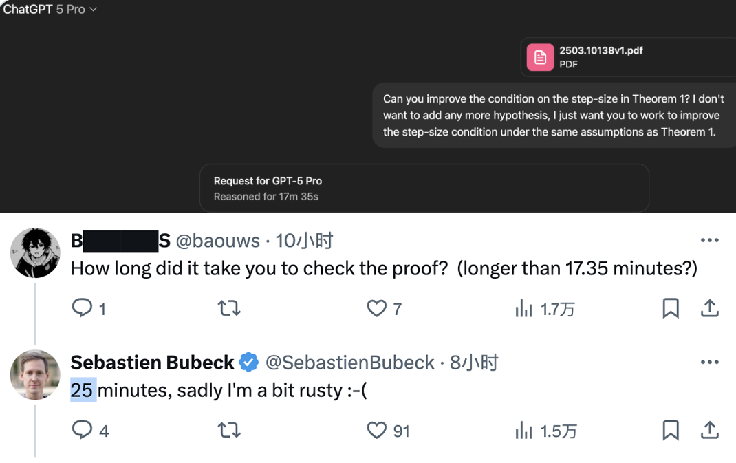 而人类检查证明过程的时间,是 25 分钟,GPT-5 Pro 读论文并进行证明的时间还要长。