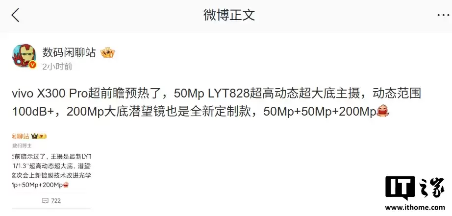 8 月 21 日消息,数码博主 @数码闲聊站 今日在微博爆料称,vivo X300 Pro 旗舰手机将搭载 5000 万像素 LYT828 超大底主摄,这款传感器拥有惊人的超高动态范围表现。