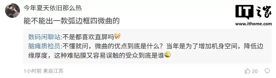 当有网友建议"推出弧边框四微曲设计"时,博主幽默回应:"不是都说喜欢直屏吗"。