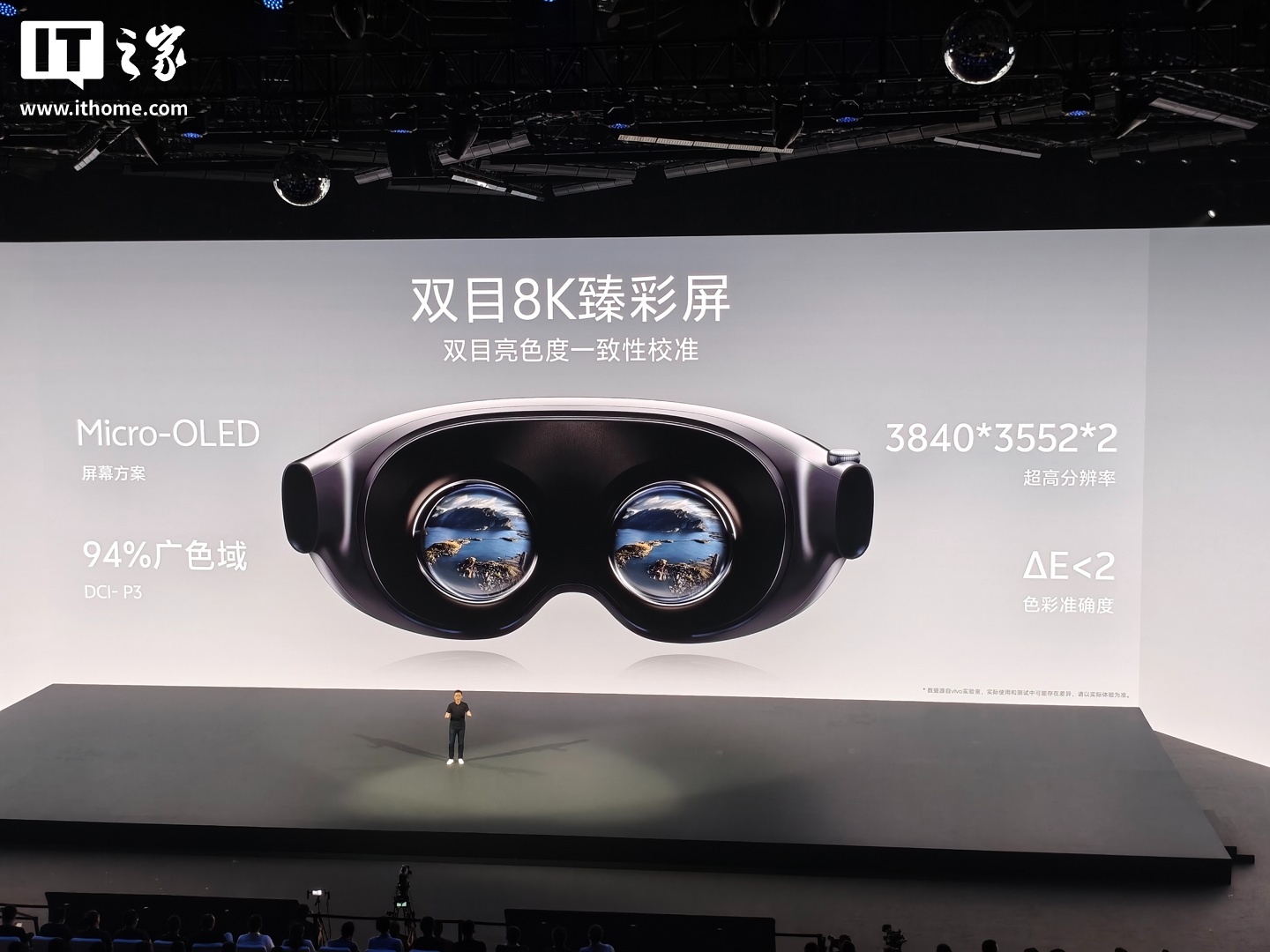 另外,vivo Vision 探索版还配备双目 8K 臻彩屏(Micro-OLED 屏幕方案),支持双目 8K 高清分辨率(3840*3552*2),覆盖 94% DCI-P3 广色域,色彩准确度 ΔE<2,宣称“双目亮色度一致”。