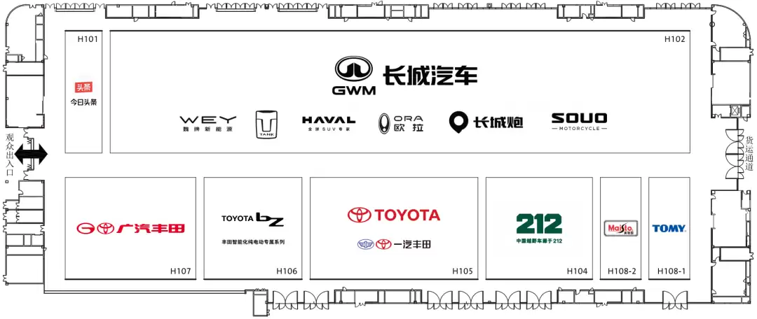 1 号馆:长城(含魏牌、坦克、哈弗、欧拉、长城炮、长城灵魂摩托)、广汽丰田、TOYOTA bZ、一汽丰田、212