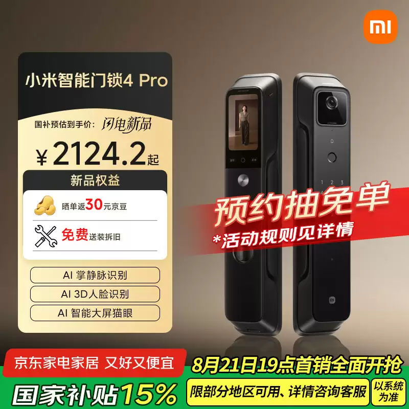 8 月 21 日消息,小米智能门锁 4 Pro 现已开售,支持 AI 掌静脉、3D 人脸识别,售价 2499 元,国补价 2124.2 元起。