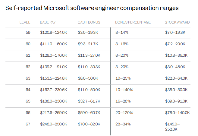 以下是根据员工在该电子表格中分享的数字,微软各团队的平均基本薪资情况: