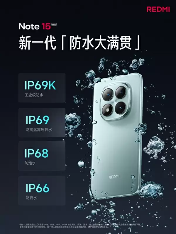 并且Note 15 Pro+新增IP69K认证,支持长时间防高温高压喷水,通过防水耐久组合测试,久用防水,获得TÜV南德五星长效防水品质认证,还有湿手触控2.0,触控不失手。