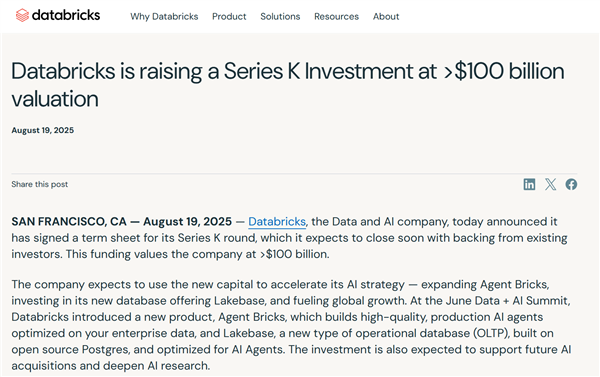 当地时间周二,全球数据、分析和人工智能公司Databricks发布公告称,正在进行一轮超过10亿美元的K轮融资,各方已经签署了投资条款清单,对应估值将超过1000亿美元。Databricks去年底进行过一轮100亿美元的融资,当时公司估值为620亿美元。