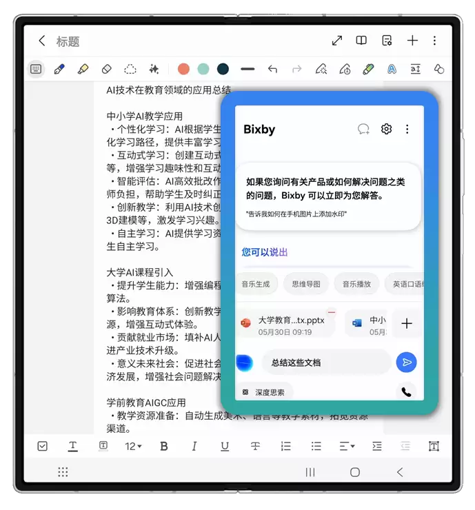 结合手机大屏多任务处理能力与智能交互工具,Bixby1可同步理解文本、语音指令、文档及图片内容。升级的Bixby进一步支持同时输入多个文档,帮用户进行总结摘要,生成思维导图以及回答用户的相关提问。目前,doc、pdf、excel、 ppt、txt等常见文档格式,Bixby都可以轻松驾驭。