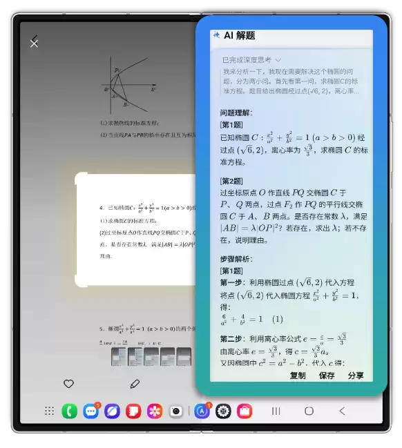 三星Galaxy Z Fold7 | Z Flip7还是用户的作业辅导小帮手,用户通过拍照或者圈选屏幕上的题目,可以快速得到问题的解答。即圈即搜3的AI解题功能不仅能有效识别题目中的文字、公式、图表等元素,还能详细解析解题步骤、思路、给出答案,甚至关联相关知识点进行拓展。从小学到高中的全学科题目都能覆盖。
