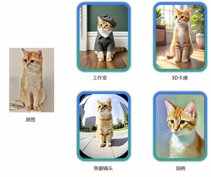升级的AI头像5功能在人像创作的基础上扩展到宠物肖像。用户只需上传宠物照片,即可一键生成俏皮卡通风、趣味鱼眼效果、专业大片等不同风格的宠物肖像照。