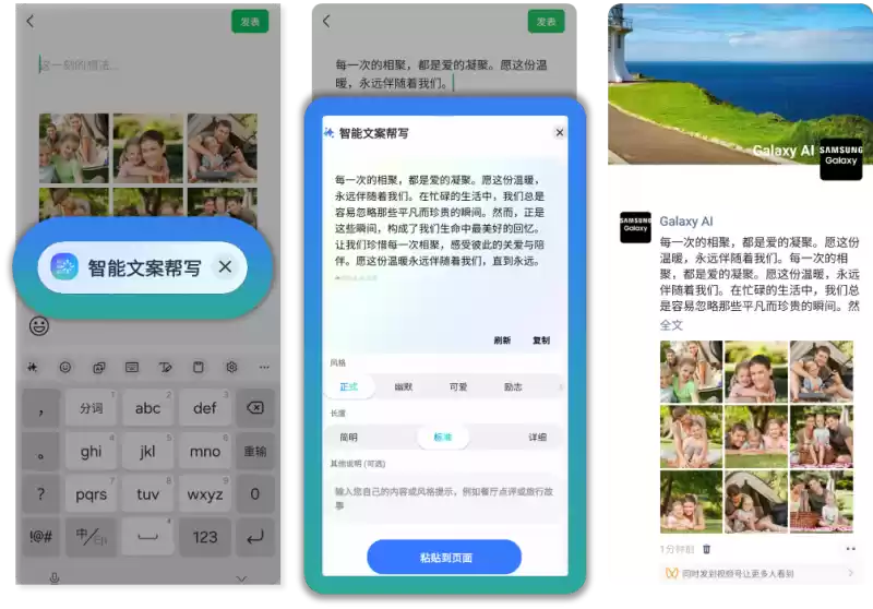 7、缩短并模拟的顺序,结果仅用于说明,根据视觉匹配情况,结果可能有所不同。智能文案帮写功能需要连接网络并登录三星账号。智能文案帮写功能仅支持生成中文文案,并一次最多可选择9张图片(支持jpg、jpeg、png、tiff、heic、bmp、webp、wbmp格式,图片大小无限制)。仅支持分享至微信、微博、小红书、QQ、微博轻享版、大众点评、饿了么、淘宝、京东、美团、拼多多应用程序,无法完全保证结果的准确性。