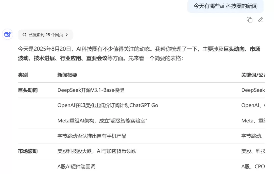 除支持更大的长文本输入外,在回答问题时,涉及信息收集的环节,DeepSeek会更多地使用表格进行信息汇总呈现,交互更友好,且回答内容更加符合人类表达习惯,语气更加自然。