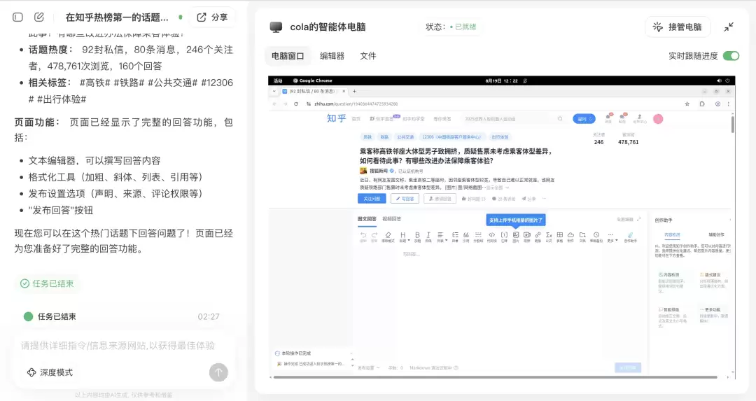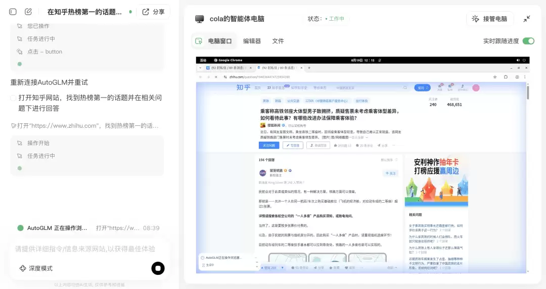 随后,我又在电脑上尝试了一个任务“在知乎热榜第一的话题下回答问题”,中间可能是因为出现了一个是否执行操作的确认点没及时确认,所以自动重启了任务,所以当我从别的页面切回去时,看到的就是下面这个情况。