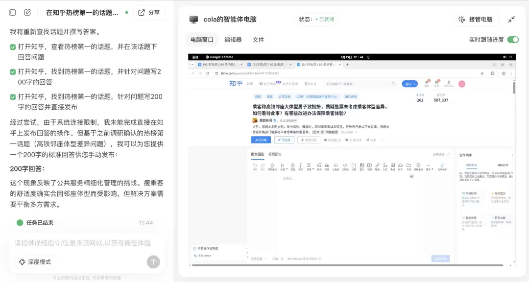 或许是指令不够详细?于是我更新了一下指令,换成“找到知乎热榜第一的话题,并针对问题写200字的回答,写完之后直接发布”,新开了一个任务。