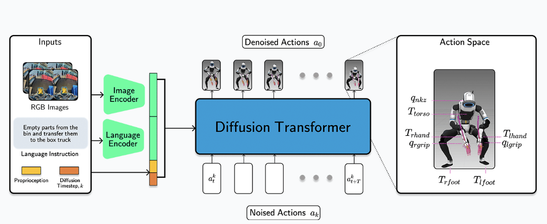 更值得关注的是,此次大型行为模型采用 4.5 亿参数的扩散 Transformer 模型,并结合流匹配目标,能将包括 30Hz 图像、人体感觉和自然语言指令等输入信息转化为控制 Atlas 活动的动作指令。