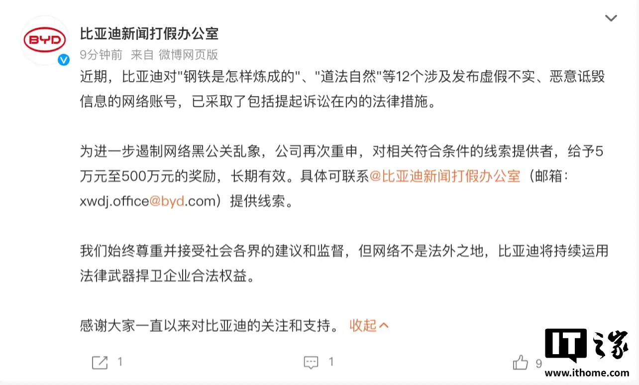 比亚迪在官方声明中强调,公司将坚决运用法律武器维护企业合法权益,对任何诋毁企业声誉的行为采取零容忍态度。