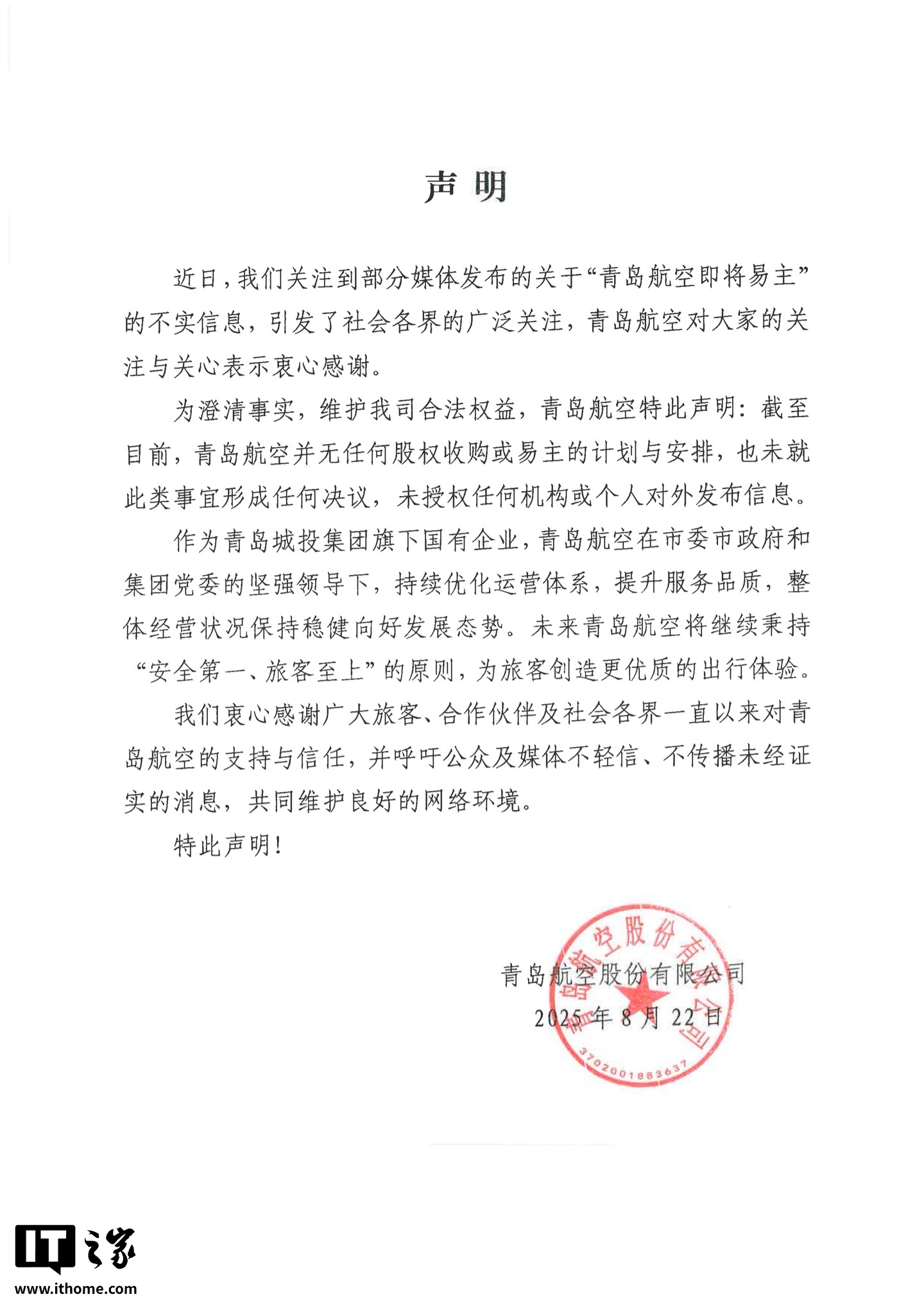 8 月 22 日消息,针对部分媒体发布的“青岛航空即将易主”的信息,青岛航空今日发布声明进行了澄清。附原文如下:
